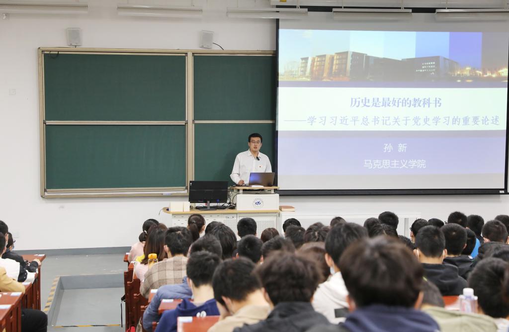 北航新闻网3月22日电(记者 王晴 通讯员 李时宇/文 记者 邸白鹭 刘耀泽/摄影)3月17日下午,北航2021年春季学期“党史导学”、“四史导学”专题思政课首讲开讲。马克思主义学院教师孙新带来课程第一讲《历史是最好的教科书——总书记关于党史学习的重要论述》。首讲设在习近平总书记主持召开学校思想政治理论课教师座谈会并发表重要讲话两周年之际,也是学院(书院)本学期党史学习教育“学习日”的开场活动。校党委书记曹淑敏、党委副书记程波同北航学院士谔书院200名学生和高等理工学院50名入党积极分子、教工党支部全体党员共同学习了本次课程。